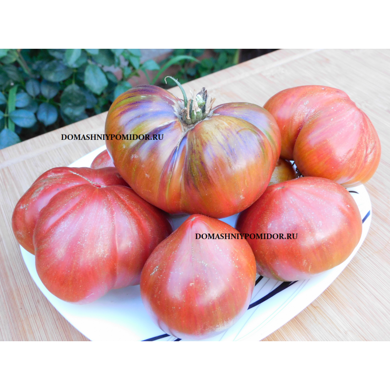 Среднеспелый, высокорослый, инд. сорт. Плоды в форме сердца, массой до 400 гр., очень красивые, малинового цвета с лёгкими полосками и плечиками окрашенными синим антоцианом, бордовой мякотью с зелеными семенными камерами, сладкие, вкуснейшие.