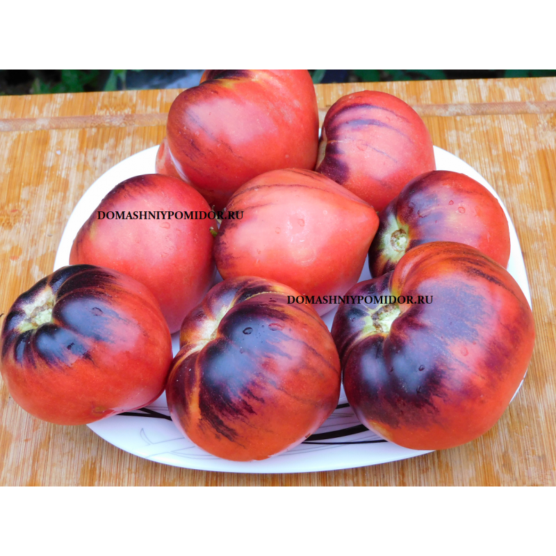 Среднеспелый, инд. сорт, высота куста около 1, 7 метра. Огромная урожайность плодов в форме сердца, малинового цвета с плечиками покрытыми синим антоцианом, массой до 500 гр., сплошная плотная, малосемянная, мякоть великолепного вкуса и аромата.
