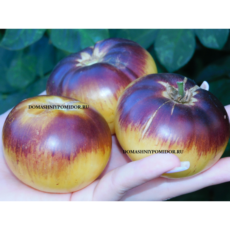 Среднеспелый, инд. сорт, высота куста около 1, 8 метра. Плоды выровненные, округлые, массой около 250 гр., нежно жёлтого цвета с плечиками окрашенными синим антоцианом, очень вкусные, сладкие как мёд, с фруктовым ароматом и послевкусием.