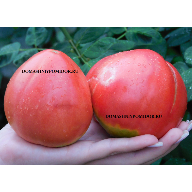 Среднеспелый, высокорослый, инд. сорт. Плоды в форме выровненного сердца, огромные, массой до 800 гр. и более, красивого розово- красного цвета с малиновой, мясистой, ароматной, очень вкусной мякотью.
