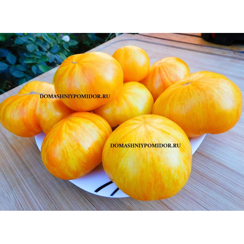 Среднеранний, инд. сорт, высота куста до 1, 8 метра. Крепкий куст, устойчив к заболеваниям. Плоды плоско- округлой формы, яркие биколоры, жёлтые со светл0- оранжевыми полосками, массой до 250гр. Внутри плоды светло-желтые, очень много сока, вкус сладкий с приятной кислинкой, яркий, хороший фруктовый аромат. Урожайный сорт.