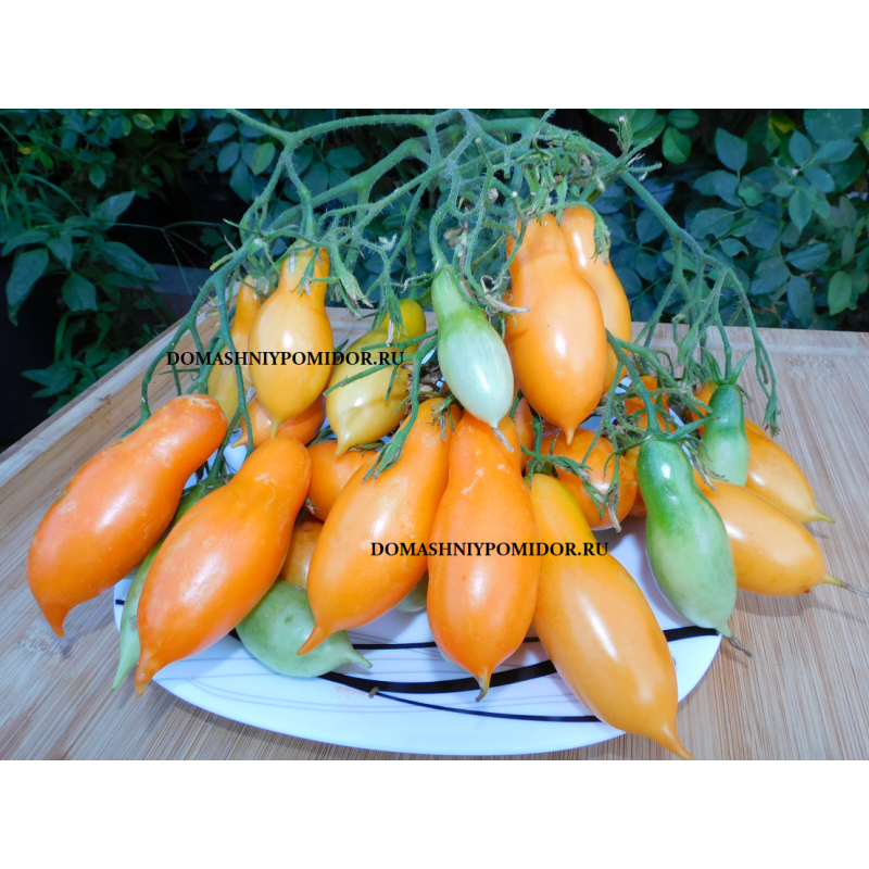 Среднеспелый, высокорослый, инд. сорт. Плоды собраны в кисти мультифлоры на сотни плодов, яркого оранжевого цвета, с длинным носиком, плотные, мясистые, сладкие. Потрясающее зрелище и урожайность!