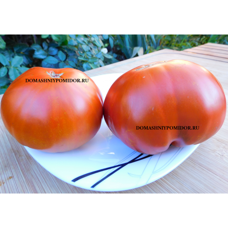 Среднеспелый, высокорослый, инд. сорт. Крепкий, мощный куст. Плоды широко- округло- сердцевидные, огромные, массой до кг., очень мясистые, практически без семян, мякоть насыщенного вишнёвого цвета, вкусная, ароматная.