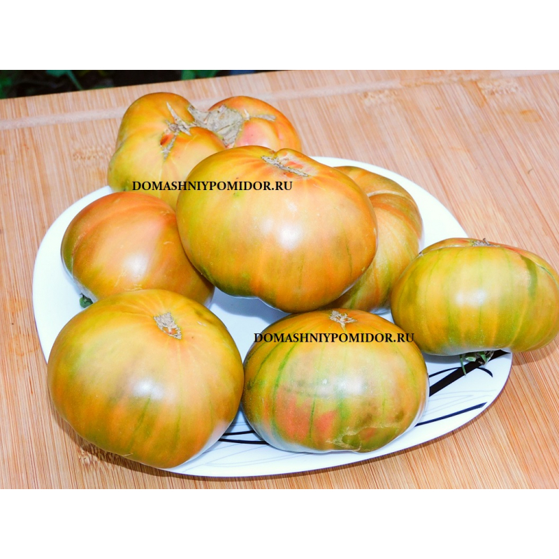 Среднеранний, высокорослый, инд. сорт. Плоды плоско- округлые триколоры, зелёно- золотого цвета с лёгким румянцем. Мясистые и сочные, сладкого и фруктового вкуса, массой до 500гр., высота куста до 1, 8 метра. Огромная урожайность! Сорт из коллекции Валдиса Пулиньша.